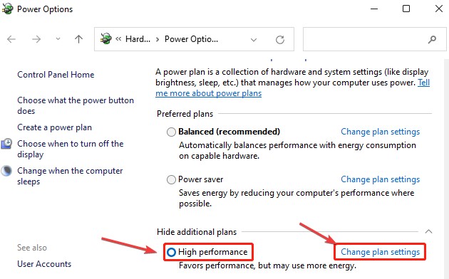 - Modifiez les paramètres du plan après avoir sélectionné l'option Haute performance.