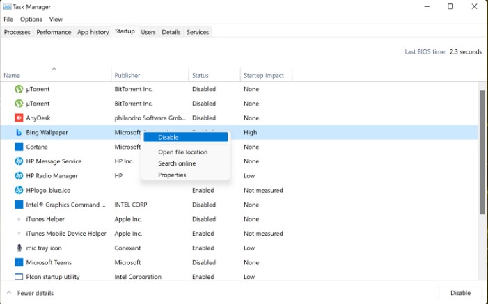 - Sélectionnez chaque élément dans l'onglet Démarrage et cliquez sur Désactiver.