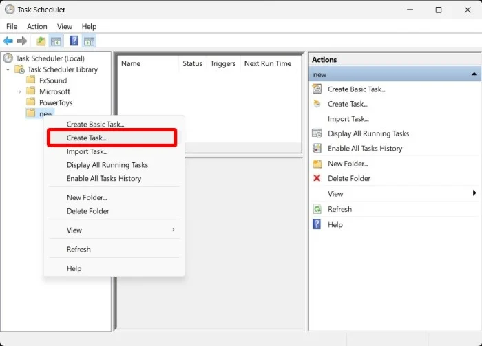- Fare clic con il pulsante destro del mouse sulla Libreria dell'Utilità di pianificazione nel riquadro di sinistra e selezionare Nuova cartella .