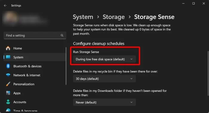 Sensore memoria ti offre la possibilità di eliminare automaticamente i vecchi file dal tuo PC Windows 11 a intervalli diversi. Puoi anche selezionare diverse pianificazioni, ad esempio la cancellazione automatica dei vecchi file quando lo spazio di archiviazione è basso. Ecco i passaggi che devi seguire:
