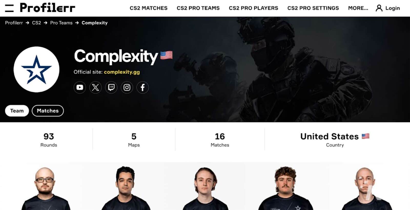 Puoi anche saperne di più sulle impostazioni di gioco e sulle prestazioni dei team G2 o Complexity CS2 sul sito web di Profiler.
