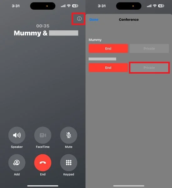 - 電話会議中に通話画面にアクセスし、画面上部の相手の名前の横にある「i」ボタンをタップします。 このアクションにより、現在通話中のすべての参加者のリストが表示されます。