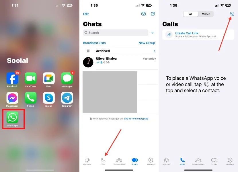 3. WhatsApp では、ここからアクセスできる電話会議を設定するための 3 つの異なる方法が提供されています。