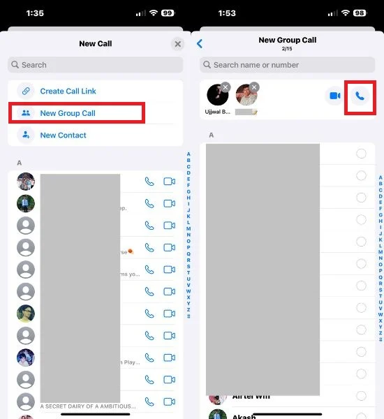 - 新しいグループ通話: [新しいグループ通話] オプションをタップします。 連絡先リストから最大 15 人の参加者を手動で選択し、電話アイコンをクリックするとすぐに電話会議を開始できます。