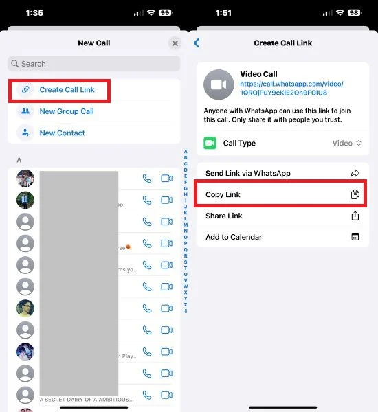 会議リンクを共有することで、複数の参加者との通話または会議を開始できます。 まず、右下隅にある「新規」ボタンをタップします。 次に、[新しい会議を作成] をクリックするだけで、固有の会議リンクが生成されます。 次に、このリンクをコピーするか、「共有」を選択して対象の参加者に配布するかを選択できます。 会議リンクを入手すれば、すべての参加者が簡単に会議に参加できます。