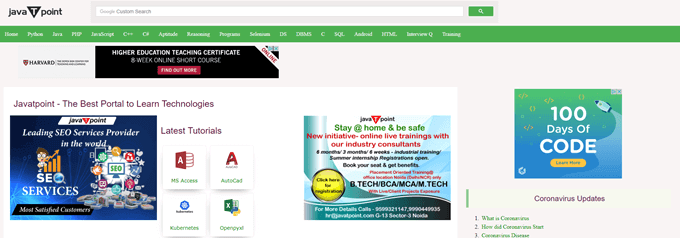 JavaTPoint działa w podobny sposób jak StudyTonight. Istnieje góra kursów dostępnych w dziesiątkach technologii i języków. Jest programowanie, DevOps, kreślenie, sztuczna inteligencja, blockchain, eksploracja danych, miękkie umiejętności dla technologów i nie tylko.
