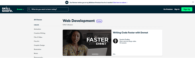 Istnieje wiele bezpłatnych kursów, a SkillShare ma płatną opcję premium, która umożliwia dostęp do większej liczby kursów. Wydaje się, że bezpłatne kursy koncentrują się na tworzeniu stron internetowych. Może nie przygotować Cię do kariery programisty, ale może pomóc wypełnić luki w wiedzy.