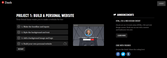General Assembly to usługa edukacyjna online z najczęściej płatnymi kursami. Ale jeden kurs jest głównie polecany i całkowicie darmowy. Dash to cały kurs, który pomoże Ci rozpocząć tworzenie stron internetowych.
