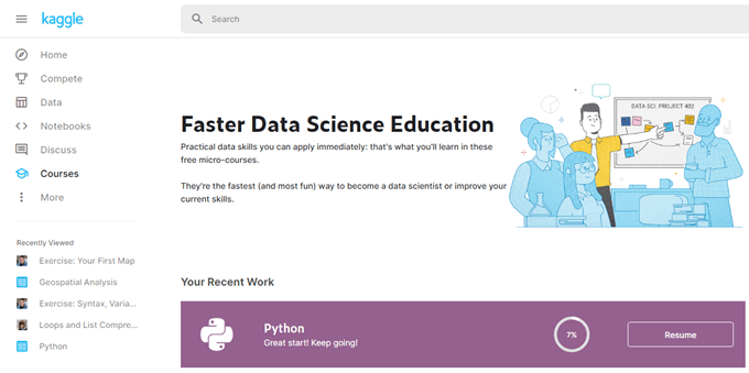 Jeśli zmierzasz w kierunku nauki o danych, Kaggle ma serię mikrokursów, które Ci się spodobają, a wszystkie sprawią, że staniesz się naukowcem danych. Jest seria 14 zajęć, każda o długości od 5 do 10 lekcji. Najlepsze, poza tym, że jest darmowy, jest to, że nie musisz instalować żadnego oprogramowania.