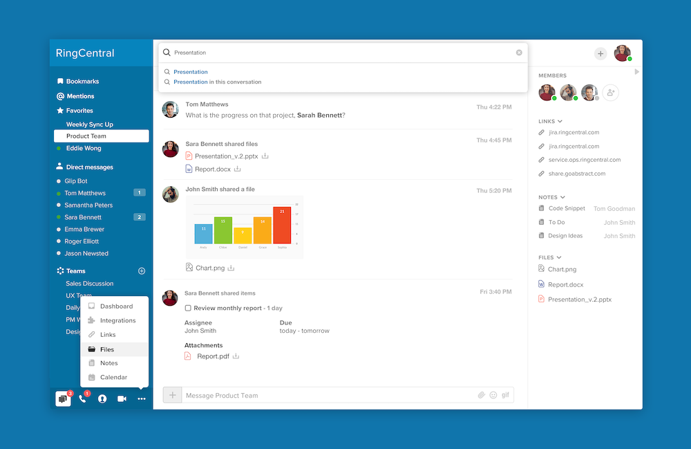 Opinie użytkowników RingCentral odegrały dużą rolę w projekcie Glip, co zaowocowało stworzeniem doświadczenia Smart Video Meetings. Oznacza to, że oprócz komunikacji wideo oferuje również czat zespołowy podczas spotkania, udostępnianie plików, zarządzanie zadaniami w celu usprawnienia przepływu pracy i nie tylko.