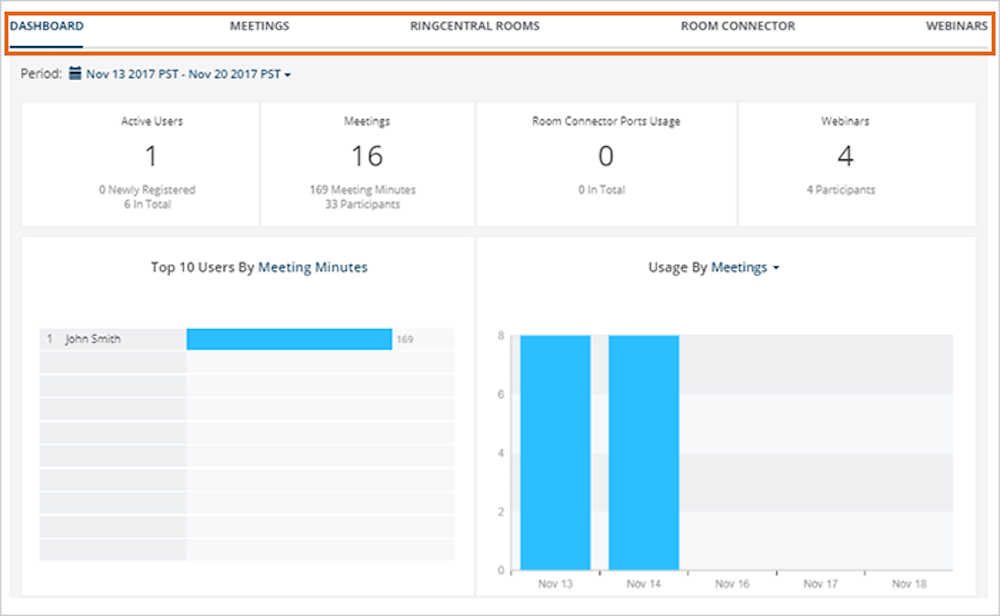 Analityka RingCentral obejmuje dane o tym, kto uczestniczył w spotkaniach, kto został na nie zaproszony i odmówił, a także jak długo każdy pracownik przebywał na spotkaniu. Pomaga to zidentyfikować określone punkty końcowe, aby gospodarze mogli udoskonalić swoją strategię spotkania. Pokazuje również czynności wykonywane przez gości podczas spotkania, takie jak nagrywanie lub udostępnianie swoich ekranów.