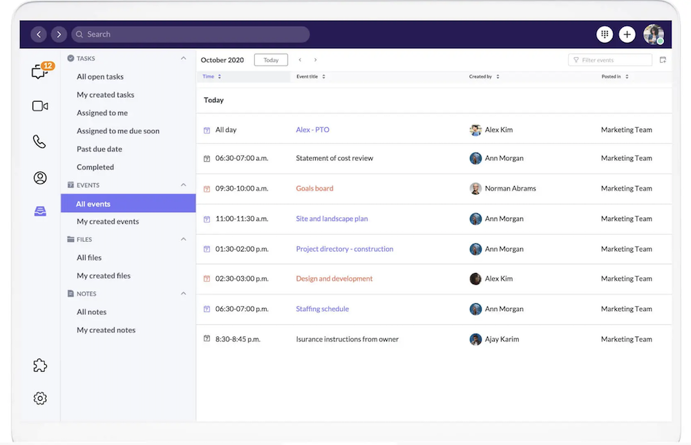 Co najlepsze, Glip ma własną natywną funkcję kalendarza, dzięki której śledzenie nadchodzących spotkań jest jeszcze łatwiejsze. Możesz tworzyć wydarzenia kalendarza dla określonych zespołów, zwane wydarzeniami zespołu, które są automatycznie podłączane do kalendarza Glip każdego członka zespołu. Kalendarz Glip następnie pokazuje datę, godzinę i tytuł każdego spotkania, kto je utworzył i które zespoły będą obecne. Możesz także oznaczyć swoje spotkania kolorami.