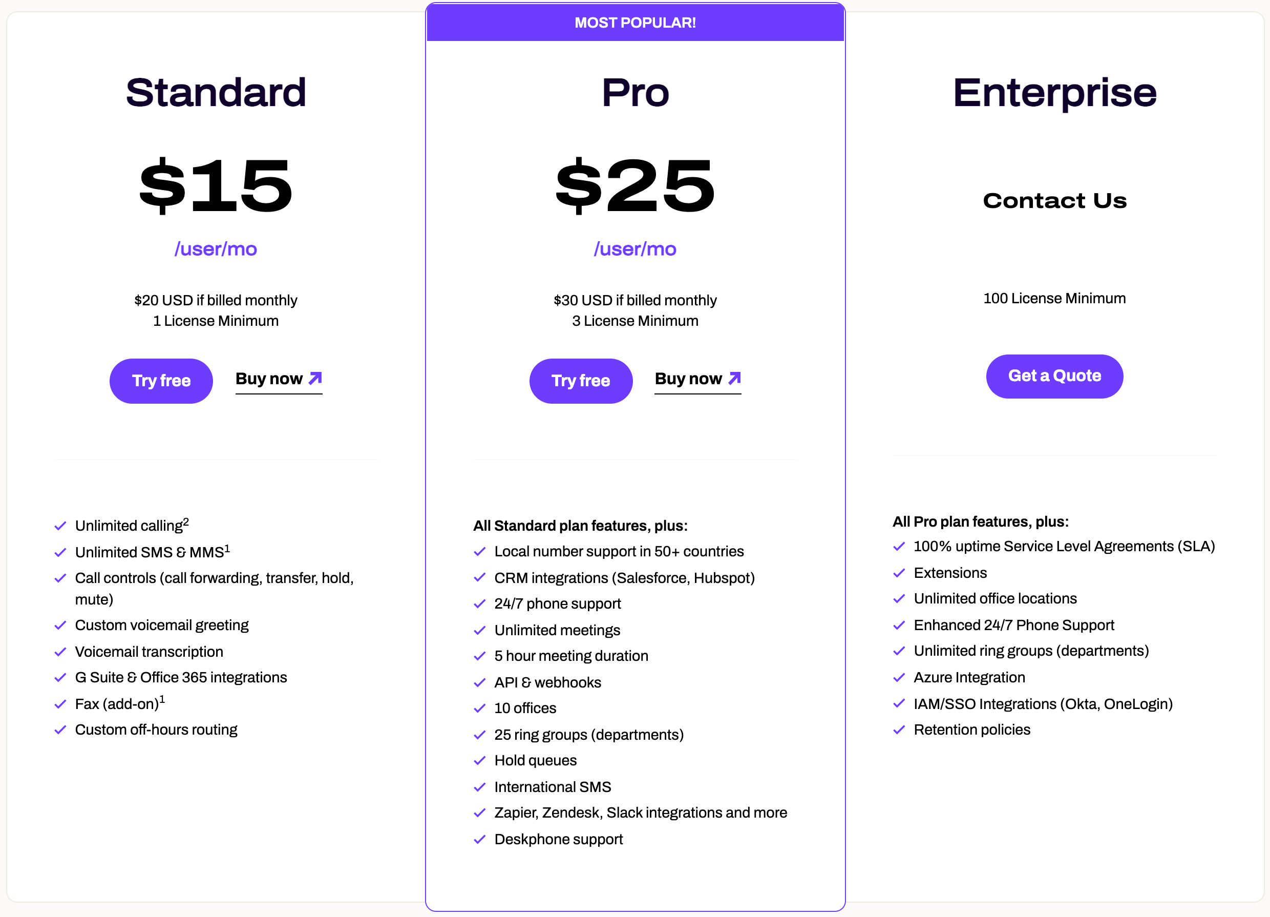 Essentials este un plan de pornire suficient și include înregistrarea automată a apelurilor și un însoțitor automat, care asigură utilizatorilor să nu piardă niciodată apelurile primite și oferă capabilități de recepționer virtual. Este posibil să nu obțineți aceste funcții într-un plan de bază de la un alt furnizor de servicii telefonice de afaceri. Această opțiune începe de la 19,99 USD/utilizator/lună. Iată o detaliere a prețurilor și planurilor suplimentare RingCentral.
