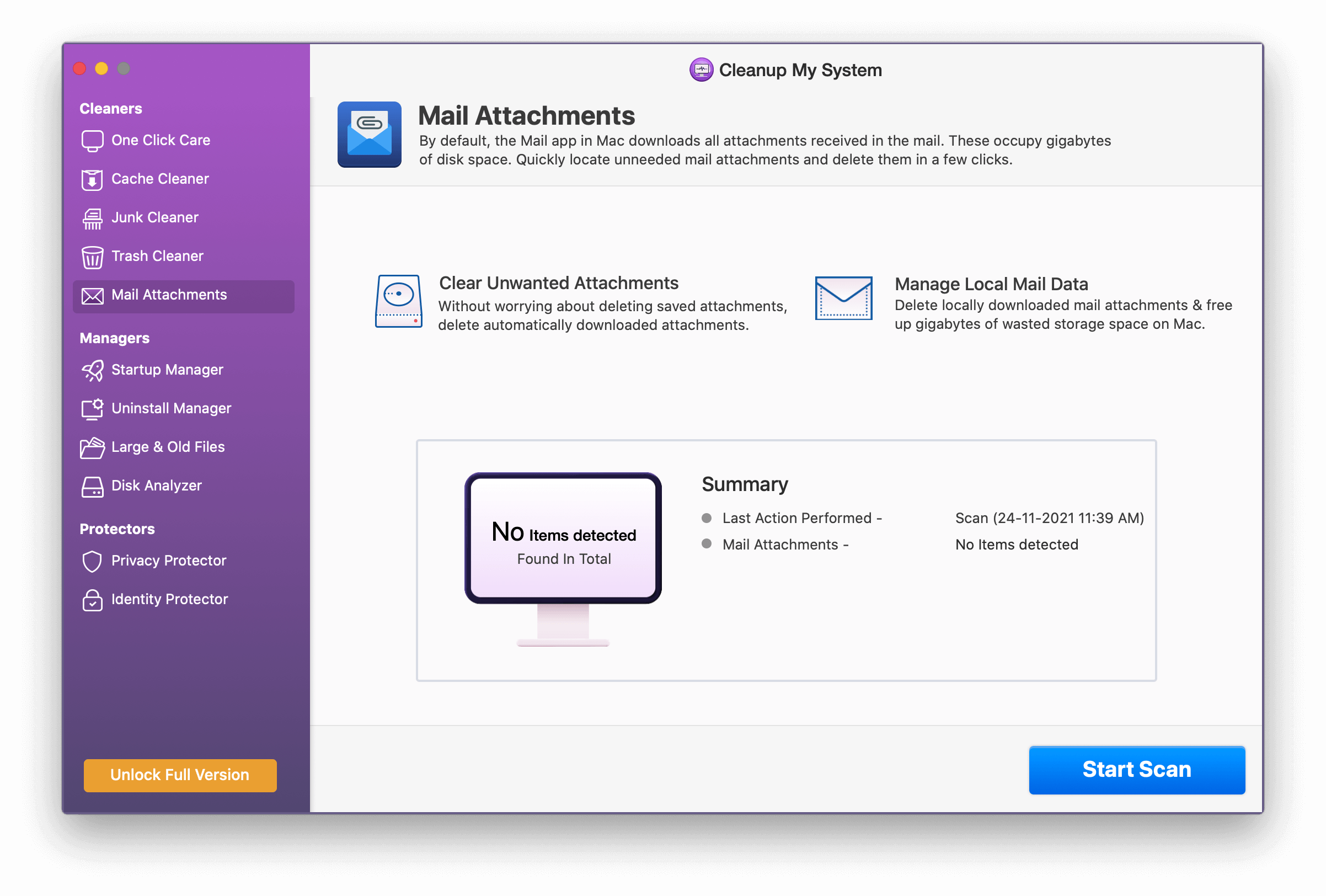 - Atașamente de e-mail - Aveți nevoie de copii locale ale atașamentelor de e-mail odată ce acestea au fost primite în căsuța dvs. poștală? Ai putea oferi un răspuns nefavorabil. În plus, aceste atașamente de e-mail descărcate sunt de vină pentru timpul necesar pentru a vă vizualiza e-mailul. Cleanup My System examinează atașamentele de e-mail descărcate local și ajută la curățarea acestora (dacă utilizatorul dorește acest lucru), permițând eliberarea spațiului de stocare.