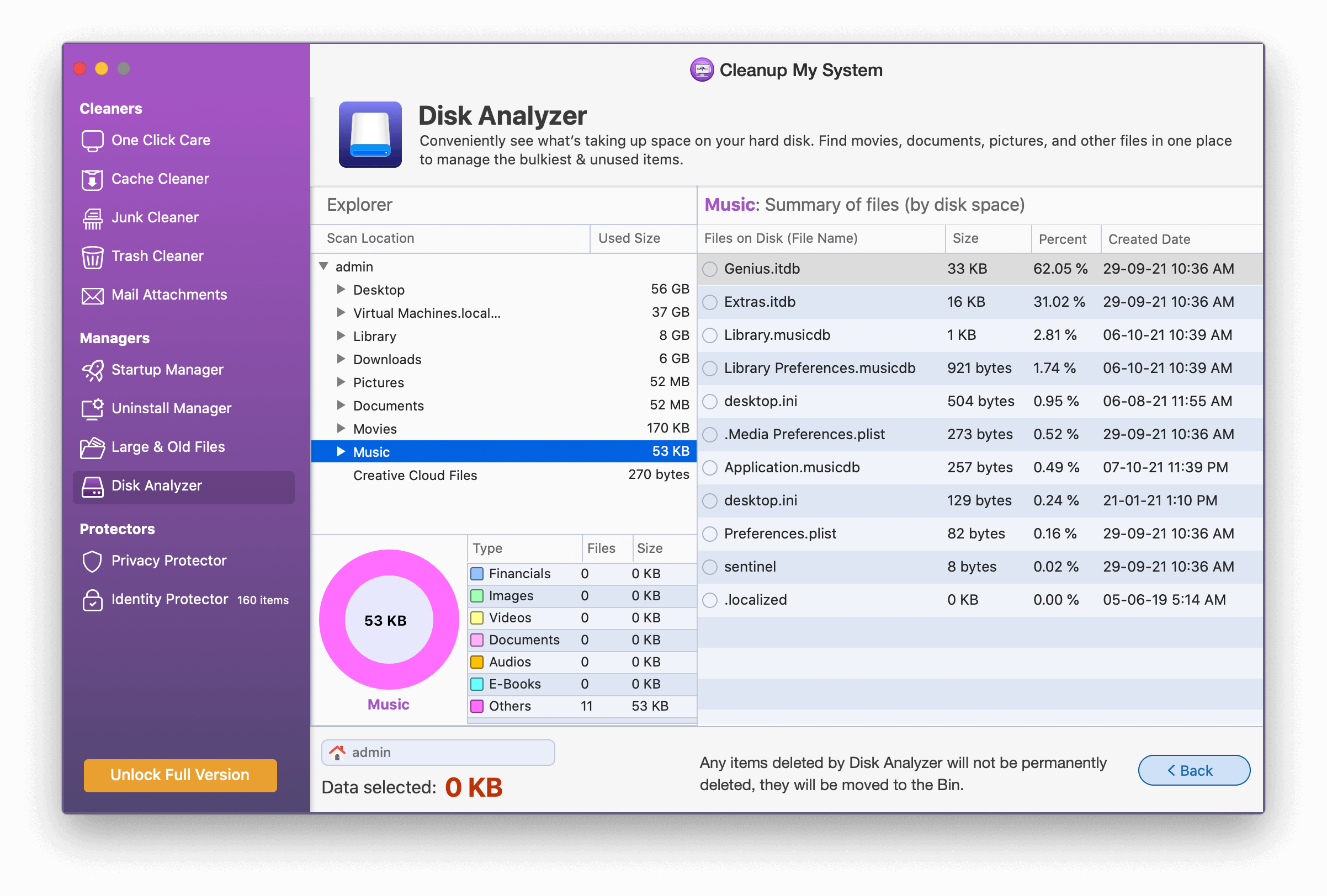 - Disk Analyzer - Instrumentul sofisticat Disk Analyzer este următorul pe acest modul și le permite utilizatorilor să identifice rapid ceea ce consumă spațiu pe hard disk. Filmele, documentele, imaginile, videoclipurile, descărcările și alte materiale pot fi găsite într-o singură locație folosind Disk Analyzer.