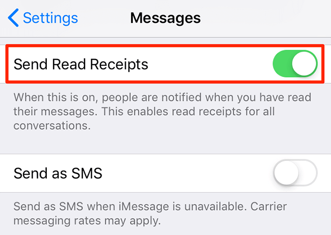 iMessage ของ Apple ยังให้ตัวเลือกแก่คุณในการเปิดหรือปิดใบตอบรับการอ่านสำหรับการสนทนาของคุณ คุณสามารถปิดได้จากแอปการตั้งค่า ถ้าคุณไม่ต้องการให้เพื่อนรู้ว่าคุณได้อ่านข้อความของพวกเขาแล้ว