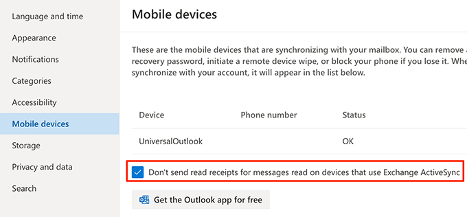 - มีกล่องกาเครื่องหมายแจ้งว่า อย่าส่งใบตอบรับการอ่านสำหรับข้อความที่อ่านบนอุปกรณ์ที่ใช้ Exchange ActiveSync ในบานหน้าต่างด้านขวา ทำเครื่องหมายที่ช่องนี้
