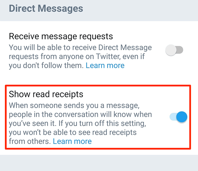 Twitter มีตัวเลือกที่ช่วยให้คุณสามารถปิดใบตอบรับการอ่านสำหรับข้อความตรงที่คุณส่งและรับจากผู้ใช้บนไซต์