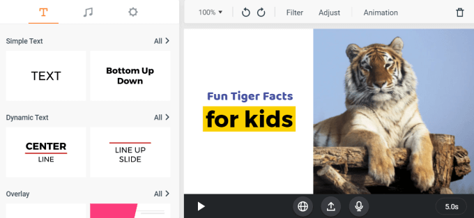 Resim, video, metin ve geçiş eklemek için çevrimiçi düzenleyiciyi kullanın. Sıfırdan başlayın veya sayısız video şablonundan birini özelleştirin. Örneğin, çocuklara gerçekleri eğlenceli bir şekilde öğretmek için kaplanlar hakkında bir video oluşturun. Video izlemek, metin okumaktan daha ilgi çekicidir.