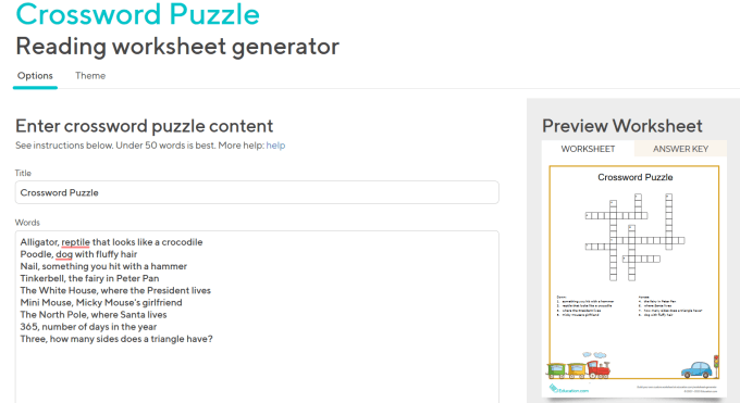 Education.com'dan Crossword Puzzle Generator ile bir tema ve anaokulundan 5. sınıfa kadar bir sınıf düzeyi seçebilirsiniz.