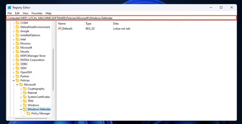完成此操作后,请按照以下步骤使用 Windows 注册表方法在 Windows 11 电脑上禁用 Microsoft Defender 防病毒软件: