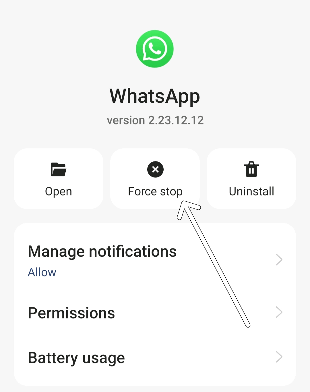 - 现在单击应用程序信息部分中的“强制停止”以停止 Whatsapp
