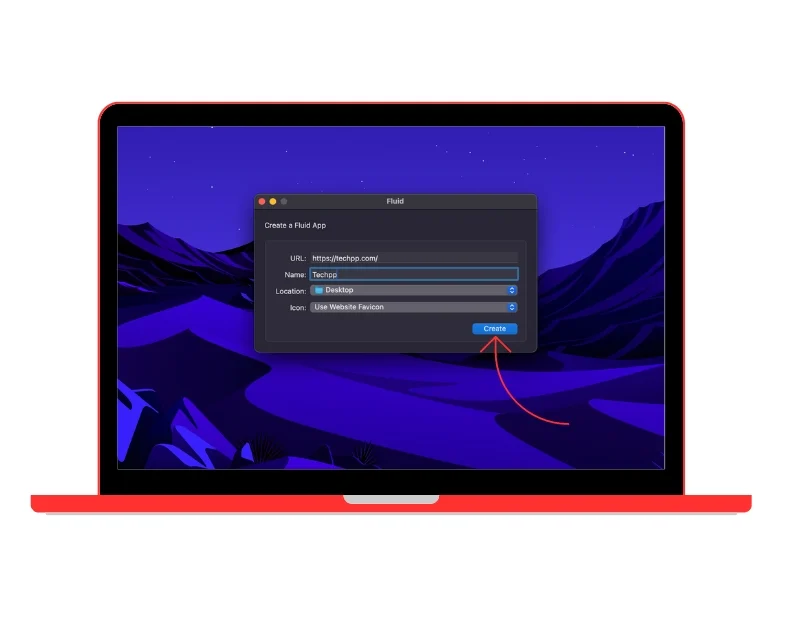 - 創建 Web 應用程序:在 Mac 上打開 Fluid 應用程序。 在 URL 字段中,粘貼您從瀏覽器複製的 URL。 輸入網站名稱。 選擇您想要安裝網絡應用程序的位置。 大多數人更喜歡將其安裝在桌面上,因為這樣更容易訪問。 最後,選擇應用程序的徽標。 您可以選擇網站圖標作為徽標或使用任何圖像作為徽標,然後單擊“創建”按鈕。