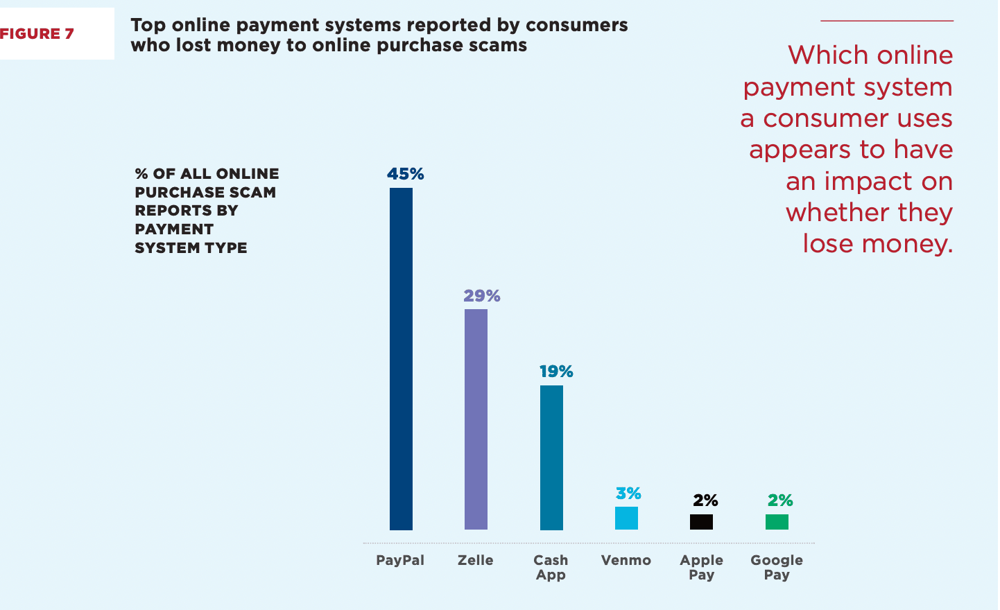 去年,商業改善局發現 Paypal 是最常被冒充的支付系統,並且被用來騙人的次數明顯多於 Zelle: